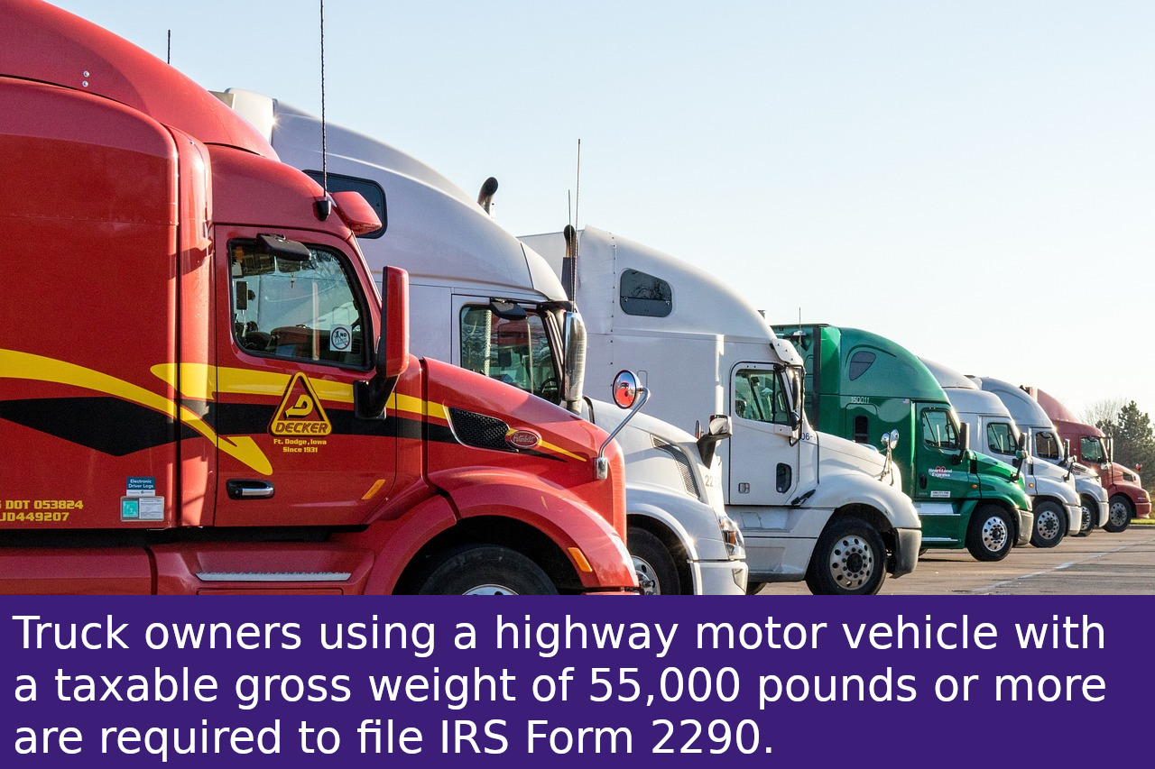The Form 2290 is a tax return that must be filed by anyone who owns or operates a heavy highway motor vehicle with a taxable gross weight of 55,000 pounds or more that is used on a public highway. The Form 2290 is a tax form used to calculate and report the excise tax owed on highway motor vehicles. The purpose of the tax is to help fund the construction and maintenance of the nation's public highway system.